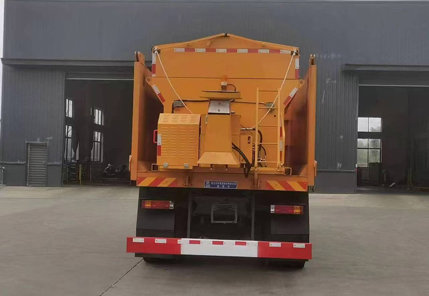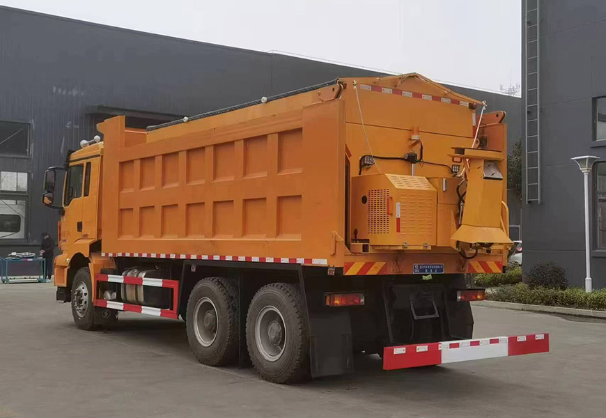 上裝配置 箱體采用優(yōu)質(zhì)碳鋼板,標(biāo)配10立方撒布機也可以選裝12立方,不銹鋼撒布機甩盤,撒布盤直徑550mm,撒布機采用 V 型料倉,結(jié)構(gòu)簡單可靠,使融雪劑自動落料,出料完全,無殘留,箭頭燈、篷布、過濾網(wǎng)、后爬梯。加裝3.5米雪鏟,可切換3.5米除雪滾刷(滾刷可選自帶動力或者液壓取力)。