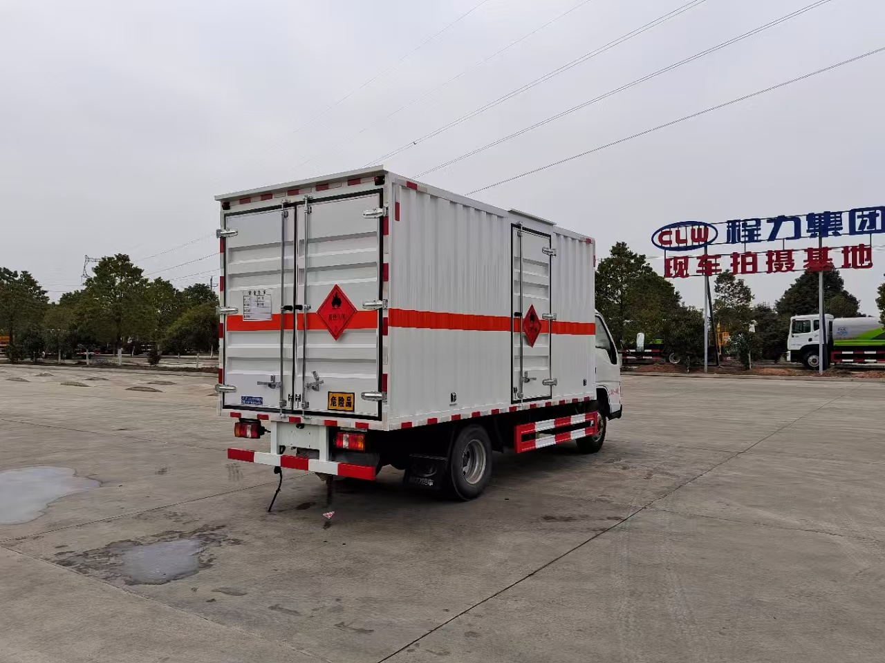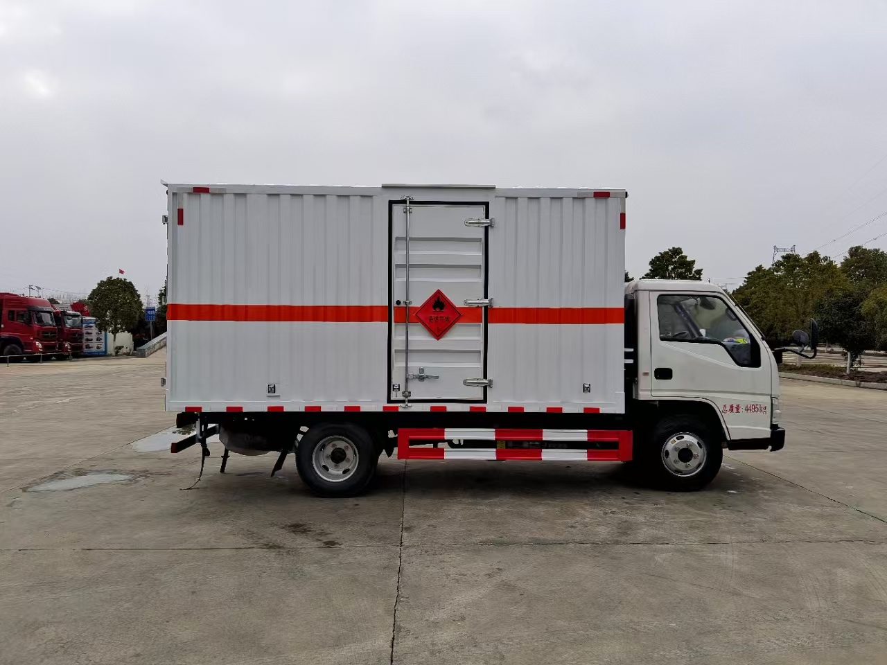 | 貨箱配置 | 廂體為雙層金屬骨架結(jié)構(gòu),外板采用冷軋鋼板,中間填充阻燃泡沫,內(nèi)飾為鋁板。底板為平板上鋪防靜電膠皮。廂內(nèi)兩側(cè)加裝固定貨物臥環(huán),門框帶防盜報警器,頂部帶煙霧報警器,廂體右側(cè)選裝側(cè)門,隨車配2個滅火器,危險標(biāo)志牌,防火帽,危險品三角頂燈。 | ||