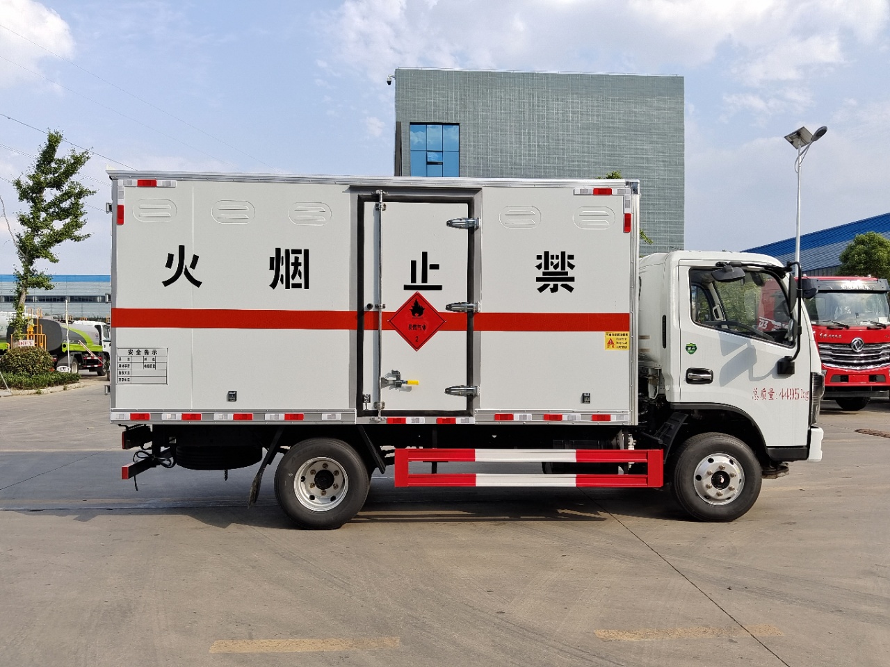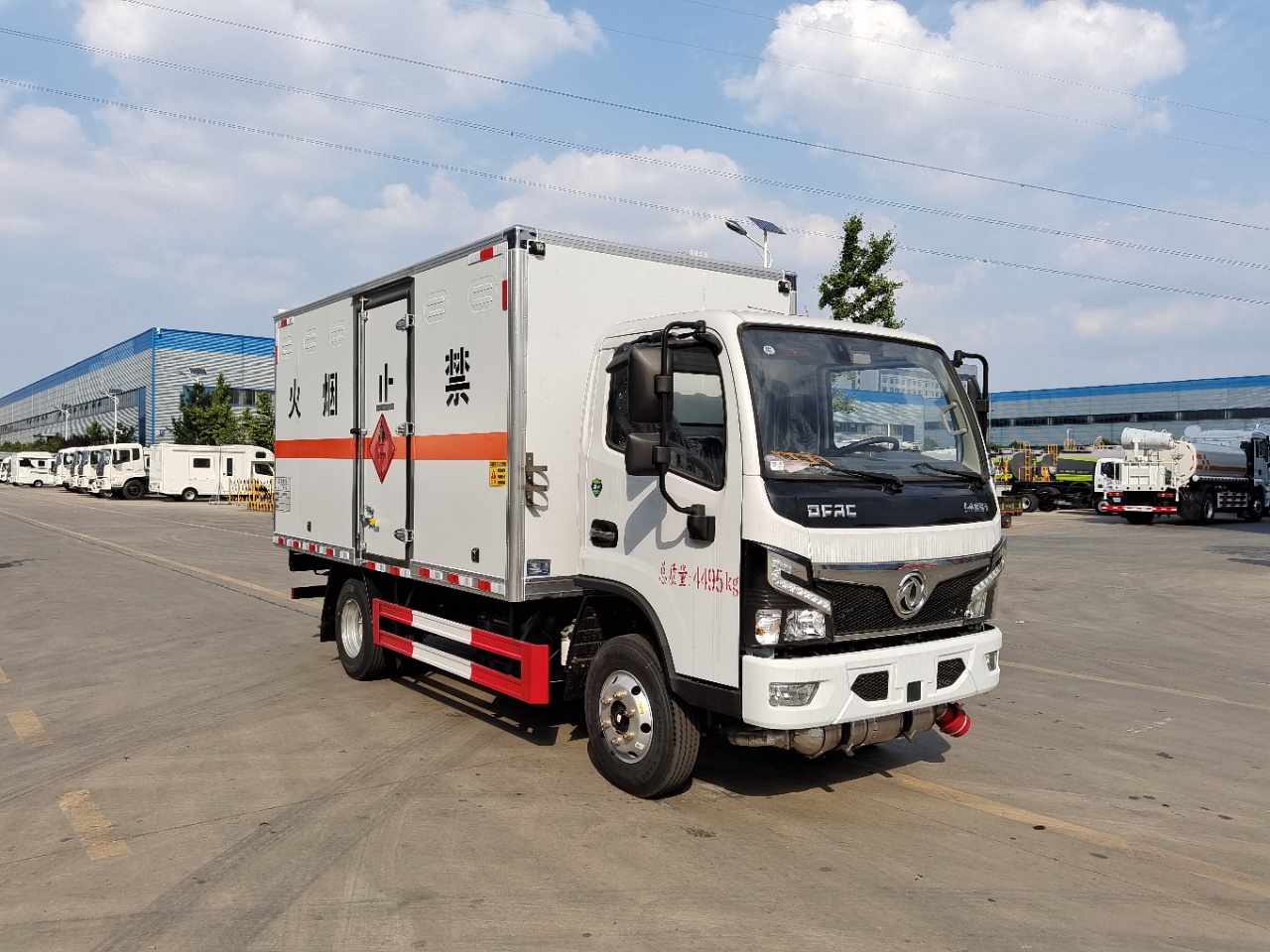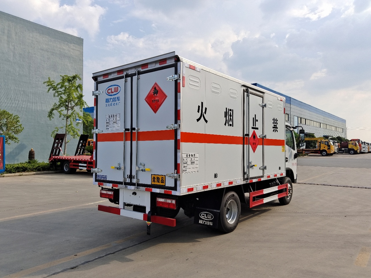 貨箱配置 廂體為雙層金屬骨架結(jié)構(gòu),外板采用冷軋鋼板,中間填充阻燃泡沫,內(nèi)飾為鋁板。底板為平板上鋪防靜電膠皮。廂內(nèi)兩側(cè)加裝固定貨物臥環(huán),門框帶防盜報(bào)警器,頂部帶煙霧報(bào)警器,廂體右側(cè)選裝側(cè)門,隨車配2個(gè)滅火器,危險(xiǎn)標(biāo)志牌,防火帽,危險(xiǎn)品三角頂燈。(也可用瓦楞板)